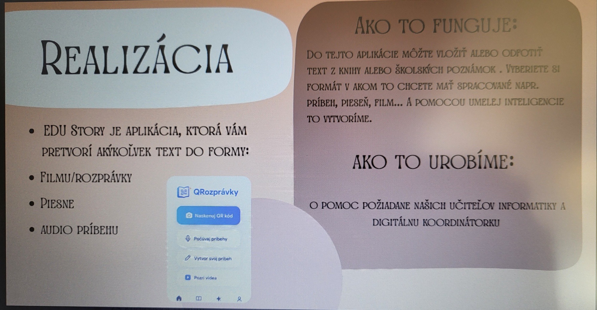 Hoci sme sa neumiestnili na popredných priečkach, porota ocenila originalitu nášho nápadu a budúcu využiteľnosť nami vytvorenej aplikácie pod názvom EDU STORY – „Tvoj text, náš hlas, ich príbeh“, ktorá dokáže pretvoriť akýkoľvek text do formy filmu, rozprávky, piesne či audio príbehu. Vyzdvihla tiež profesionálne spracovanie a prezentáciu, ktorou naši žiaci zaujali v konkurencii stredných škôl.